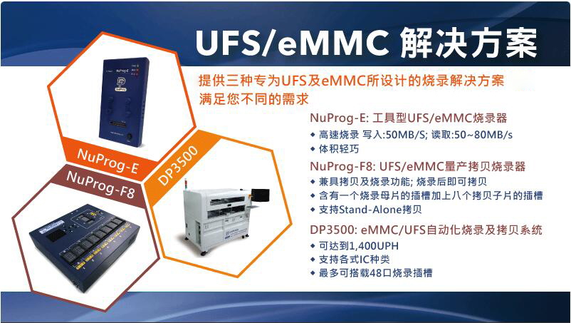 我们有工程型的,1对1的烧录工具,也有手动的一拖八的烧录方案,当然,如果你的量足够大,我们还有DP350全自动的EMMC/UFS烧录系统,帮你解决这种大容易芯片的数据烧写问题。
